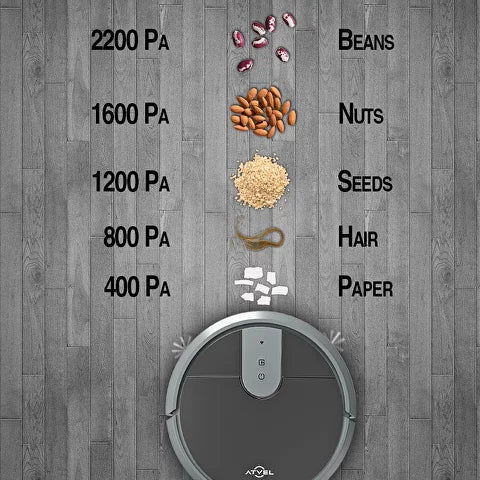 Die Saugleistung des Atvel R70 erreicht 2200 Pa, wodurch Sie Schmutz unterschiedlicher Größe entfernen und Staub aus Teppichen holen können.