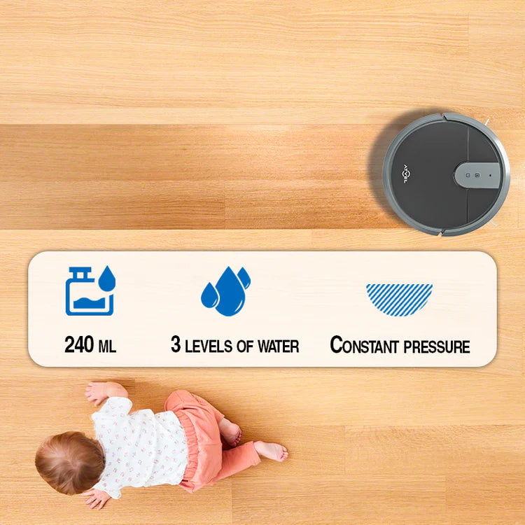 Der Wassertank des Roboters hat ein Fassungsvermögen von 240 ml und ist mit einem elektronischen Wasserdurchflussregler ausgestattet. Die Durchflussmenge lässt sich stufenlos über die App regeln. Das Design der Serviettenhalterung sorgt für einen gleichmäßigen Druck auf die zu reinigende Oberfläche, was die Qualität der Schmutzentfernung verbessert.