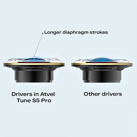 Die Lautsprecher des Atvel Tune S5 Pro sind so konzipiert, dass sie längere Hübe und mehr Platz für die lineare Verschiebung bieten. Dank der speziellen Struktur haben die Lautsprecher genügend Platz, um Surround-Sound und tiefe, detaillierte Bässe zu erzeugen.
