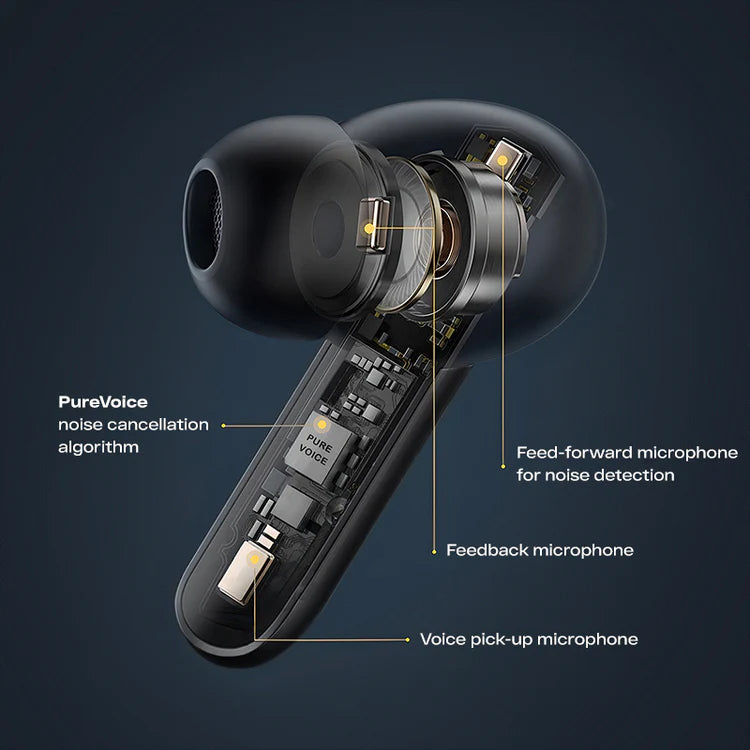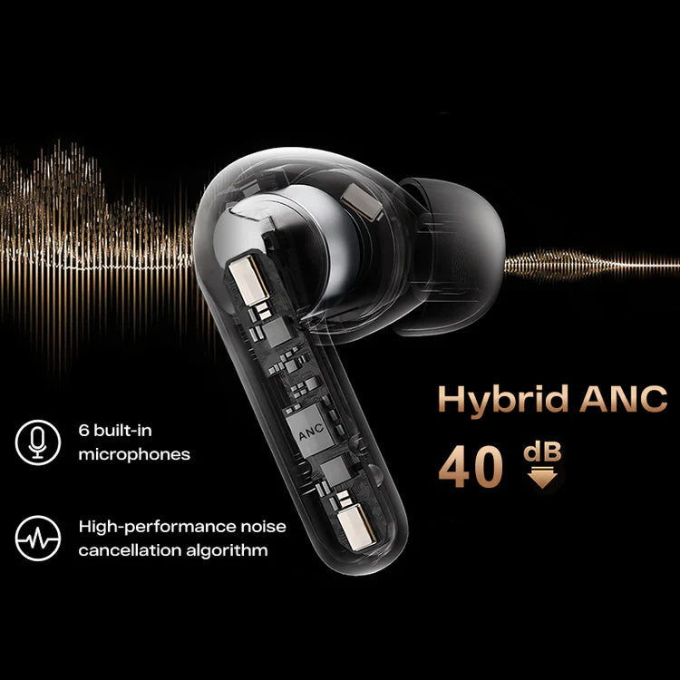 Das Hybrid Noise Cancellation System mit 6 Mikrofonen nimmt Umgebungsgeräusche auf und blockiert sie. So wird eine Geräuschunterdrückung von bis zu 40 dB erreicht. So können Sie sich auf das Wesentliche konzentrieren oder in Ihre Lieblingsmusik eintauchen.