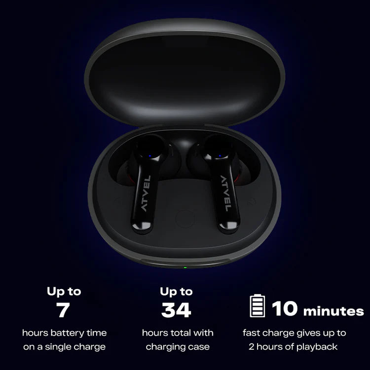 Atvel Tune S5 Pro-Ohrhörer bieten bis zu 7 Stunden Nutzungsdauer mit einer einzigen Ladung und bis zu 34 Stunden mit einer Ladung über das Etui.
